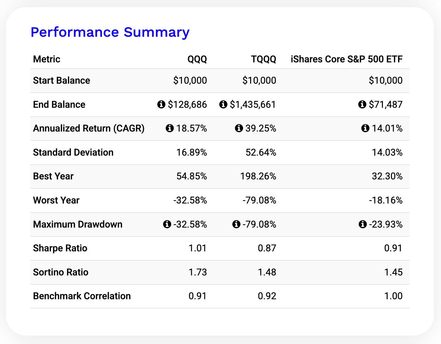 For example, the maximum drawdown of TQQQ during the period reached −79%.
