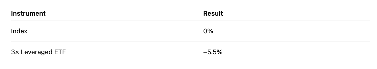 Even when the underlying index moves sideways, leveraged ETFs can gradually lose value due to daily leverage resets and compounding. This effect is commonly referred to as volatility decay.